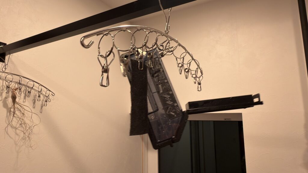 - 丸1日、ピンチハンガーで完全に乾かす ここが一番重要です!生乾きのまま本体に戻すと、排気がとんでもなく臭くなります。わが家では洗濯用のピンチハンガーに普通に吊るして、丸1日(24時間)しっかり干しています。