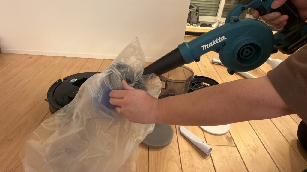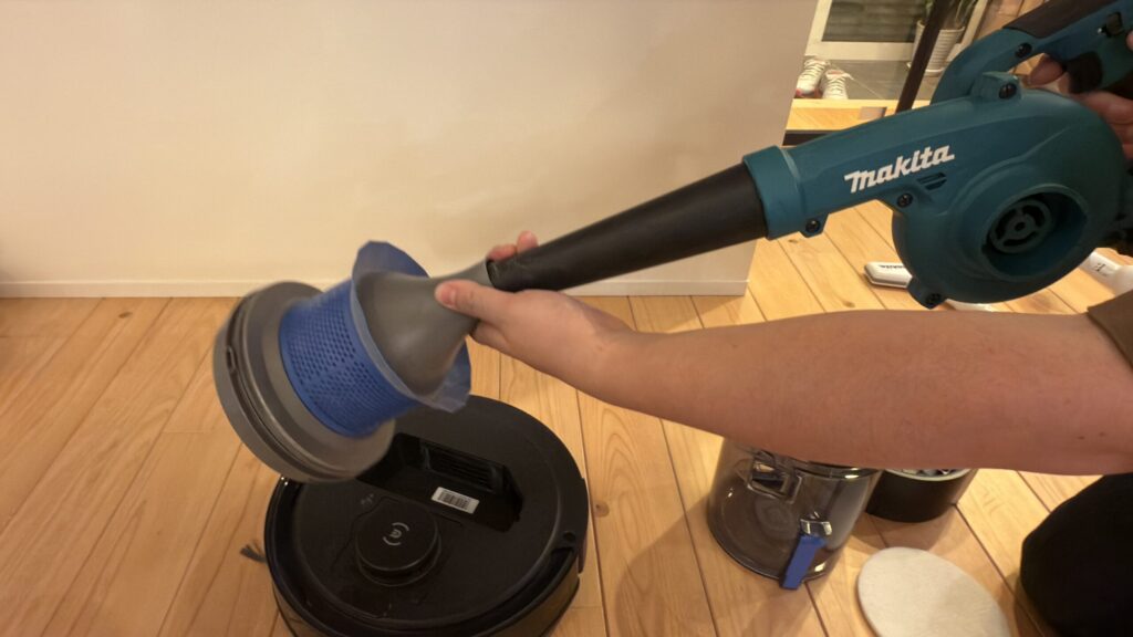 💡 N20特有の「水洗いNG」を解決する裏技 最新機種のN20のサイクロンステーションにある「マルチコーン構造」の部分は、メーカーから水洗いが推奨されていません。そこでわが家では、マキタのブロワを活用しています!内部に風を送り、ホコリを一気に吹き飛ばしています。水を使わずあっという間に綺麗になるので、N20ユーザーにはめちゃくちゃおすすめです。ただ、室内でやると埃が舞い散るので人気のない屋外で行うことをおすすめします。