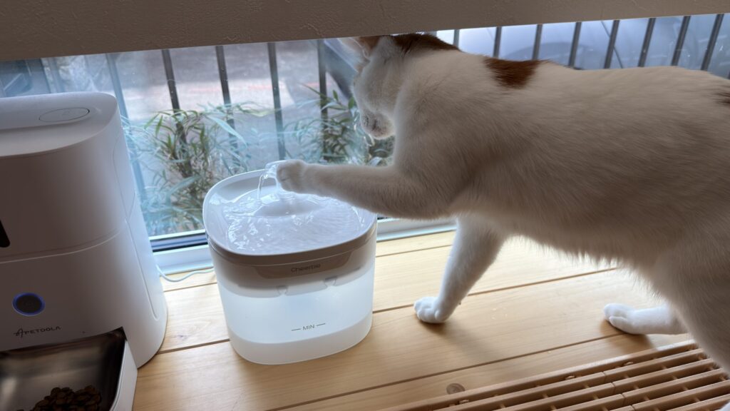 結果として、以前のお皿時代よりも明らかに水を飲む量が増えました。猫の健康(特に腎臓などの泌尿器系)にとって水分補給は最重要なので、これだけでも買った価値は十二分にあったと感じています。