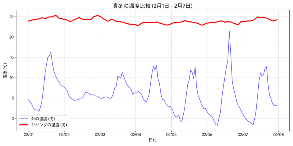 しかし、赤い線(リビングの温度)は強烈な寒波を完全に無視!