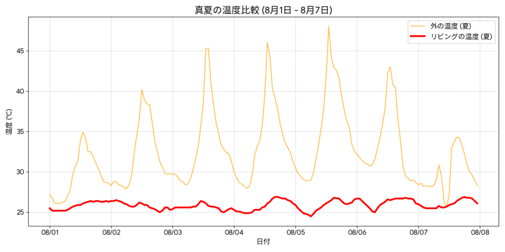それに対し、赤い線(リビングの温度)は「26〜27度」の快適なラインでピタッと一直線です。