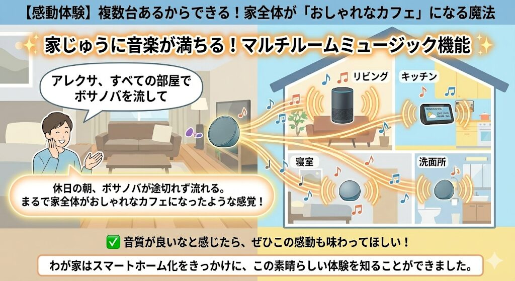 すると、リビング、キッチン、寝室、洗面所…家中のAlexaから一斉に音楽が流れ出します。