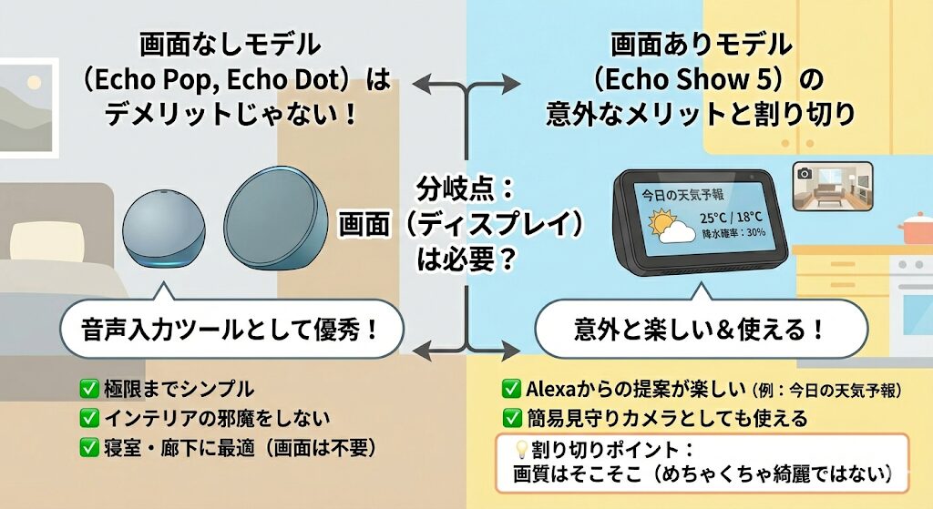 Echoシリーズを選ぶ際、もう一つの分岐点になるのが「画面(ディスプレイ)が必要かどうか」です。