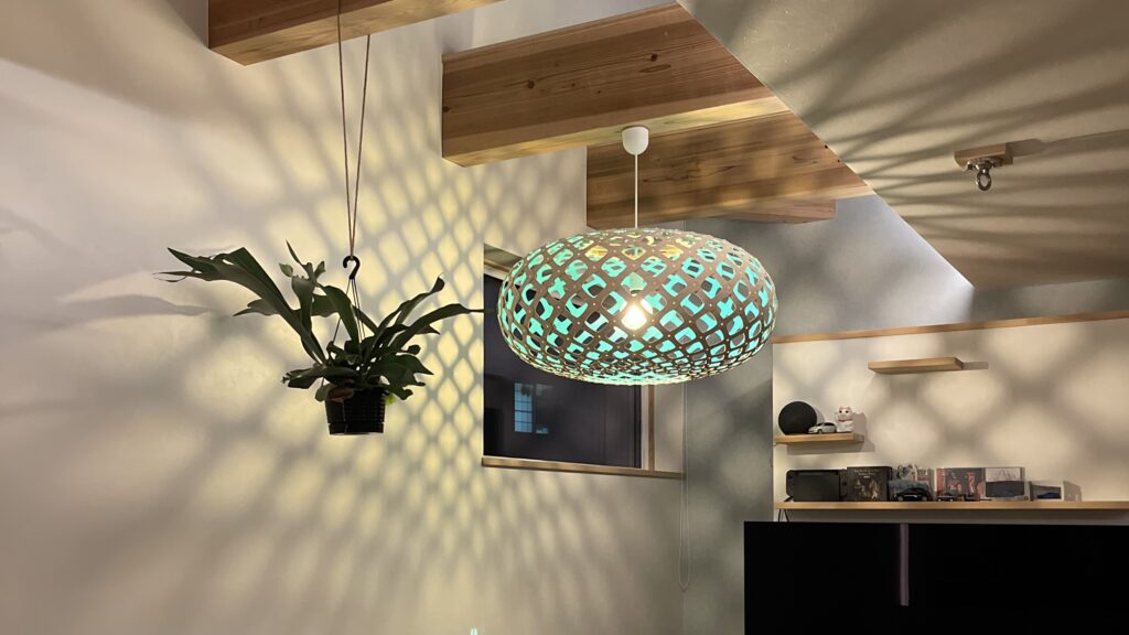 照明専門店で出会ったその直径800mmの竹製照明は、光を灯した瞬間に、周囲に幻想的な幾何学模様の影を放ちました。「この影を吹き抜けの壁いっぱいに映したい」。この一目惚れが、すべての設計の起点となりました。